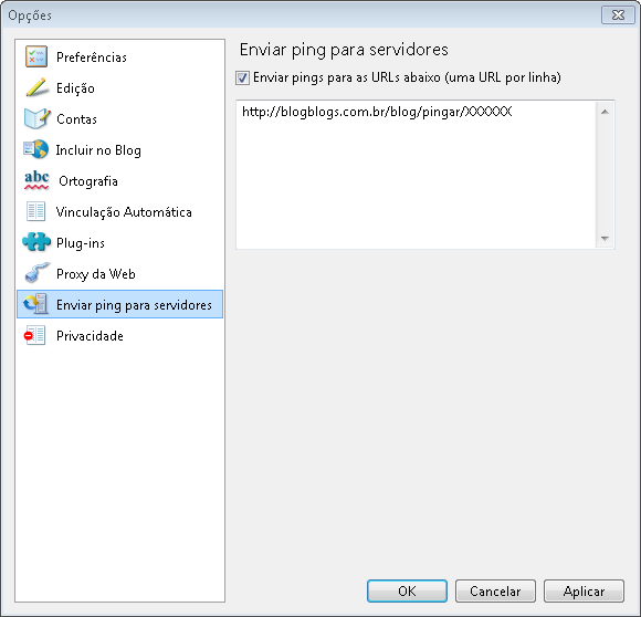 Existe o campo “Enviar ping para servidores” no Live writer (imagem abaixo) mas não existe nenhuma informação na net sobre como configurar com o Blogblogs, em minha